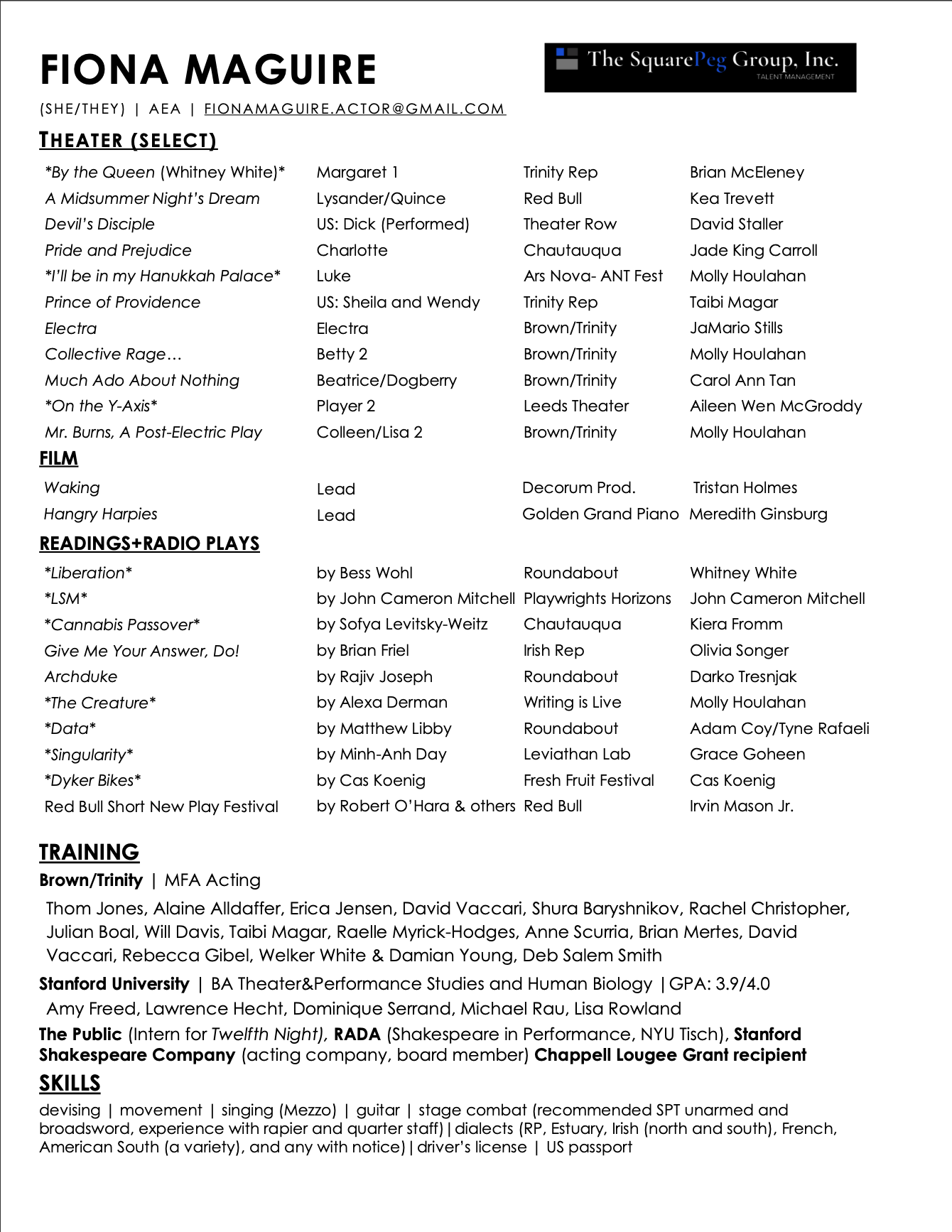Born and raised in Los Angeles. Went to Stanford for undergrad where I majored in both Theater&Performance Studies (TAPS) and Human Biology with a concentration in Narrative Neuroscience. Upon graduating I went to Brown/Trinity where I received my MFA in Acting.